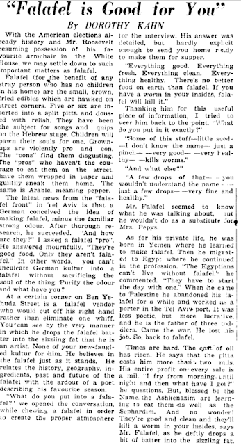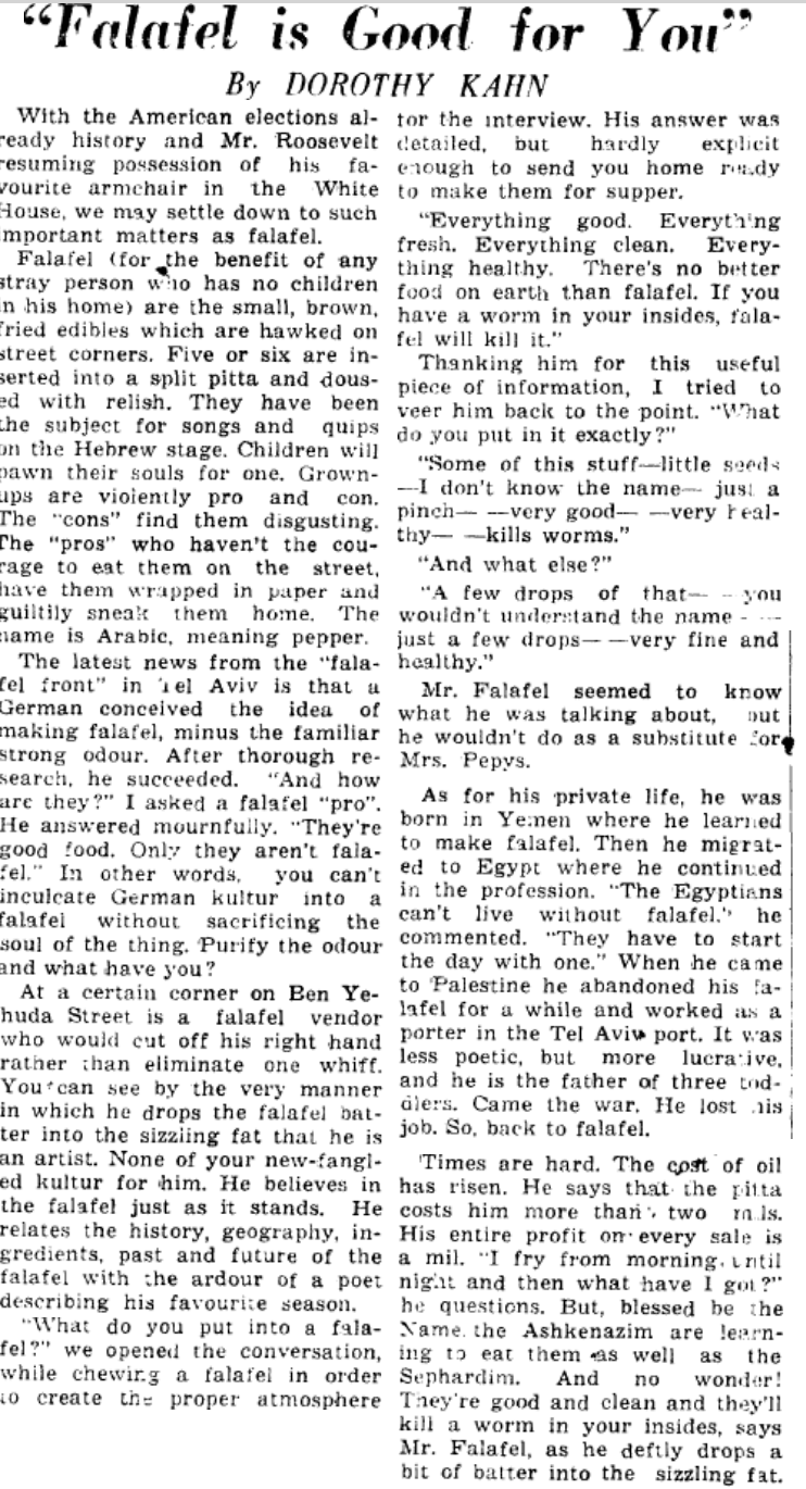 Maintenant, personne ne doute que le falafel est antérieur à Israël. Mais l’idée de falafel dans la pita avec salade et garnitures est pour autant que nous le savons de Juifs yéménites qui ont immigré en Israël. Il y a un certain nombre de sources mais pas de source arabe qui prouve que la pita existait avant les années 1940, alors qu’elle gagnait déjà en popularité en Israël, même parmi les Ashkénazes, comme le montre ce récit de 1940 Palestine Post :
