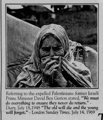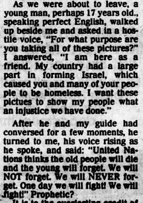 La première citation que j’ai pu trouver dans le contexte des Palestiniens était tirée d’une lettre du 12 juin 1986 au rédacteur en chef du Lansing State Journal où l’écrivain dit qu’un jeune Arabe palestinien dans un camp de réfugiés lui a dit en 1955, « Les Nations Unies pensent que les vieux mourront et que les jeunes oublieront. Nous n’oublierons jamais !… Nous nous battrons !