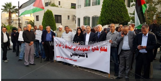 Une poignée de gens à l’air ennuyé font une manifestation timide devant l’ambassade britannique à Amman en Jordanie.