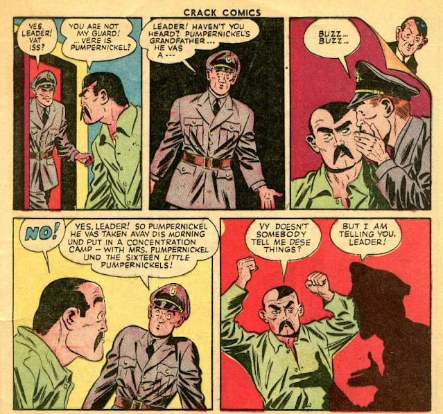 Captain Triumph était l’une des nombreuses bandes dessinées de super-héros les plus oubliées des années 1940. Dans un épisode, Triumph affronte un composite à peine déguisé d’Hitler, Hirohito et Mussolini nommé « Mussler »: l’ami de Triumph se fait passer pour le gardien du dictateur, et lorsque le personnage d’Hitler demande à savoir ce qui est arrivé à son assistant régulier, on lui dit que son grand-père s’est avérée être un … type de personne sans nom.