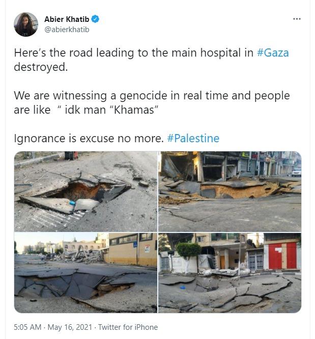 Selon Abir Khatib, voici des photos de la route qui mène à un hôpital de Gaza. Il s’agit bien de la rue al-Wahda, qui mène directement à l’hôpital Shifa où le Hamas a un quartier général militaire.